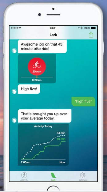 - Lark is a fitness app that uses messaging interface and only allowing canned responses to allow you to track fitness metrics and log data like food intake.
